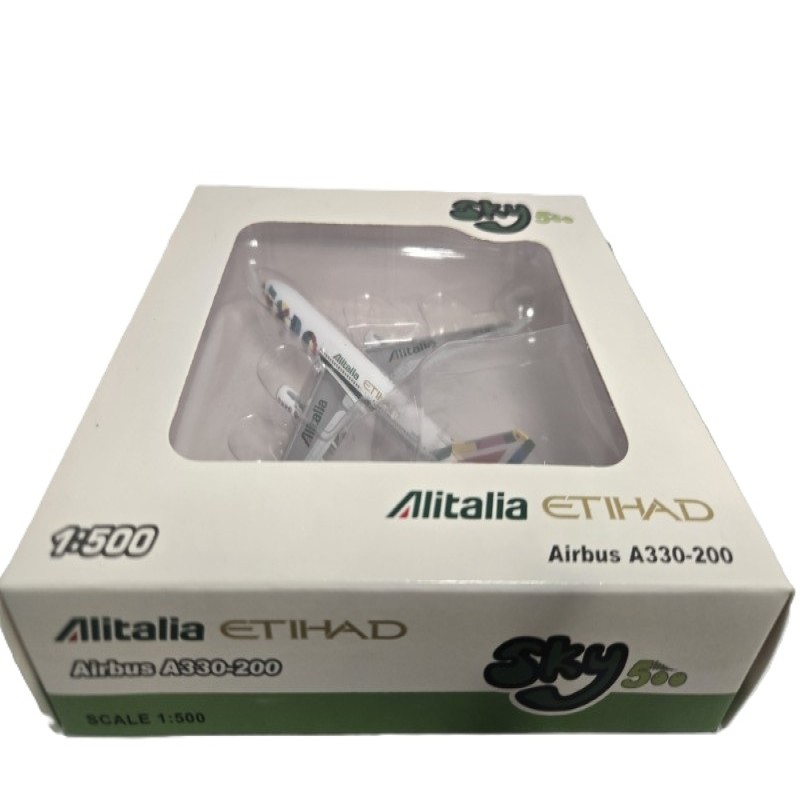 This die-cast metal model airplane is in a scale of 1/500. The model is approximately 5 ¾ inches long and has a wingspan of 5 inches. Suitable for collectors aged 14 and above.