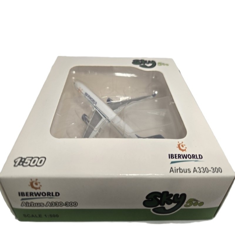 This die-cast metal model airplane is in a scale of 1/500. The model is approximately 5 ¾ inches long and has a wingspan of 5 inches. Suitable for collectors aged 14 and above.